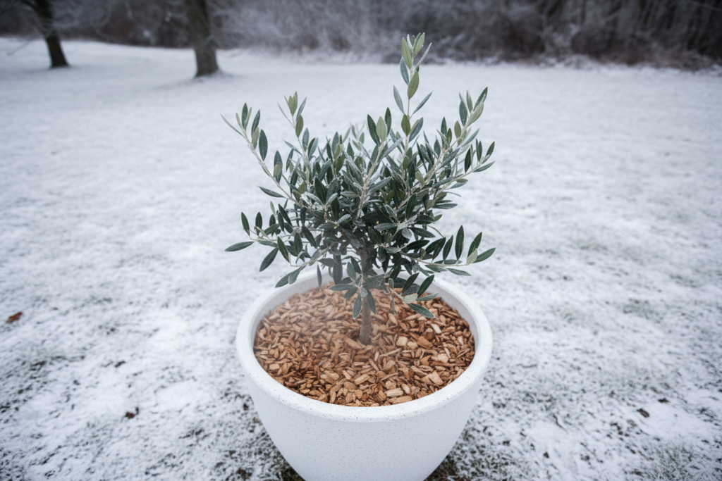株元にバークチップや腐葉土、わらなどを敷いてあげると、地面の温度が下がりにくくなって、根っこを霜から守ってくれます。見た目もおしゃれになって一石二鳥です。